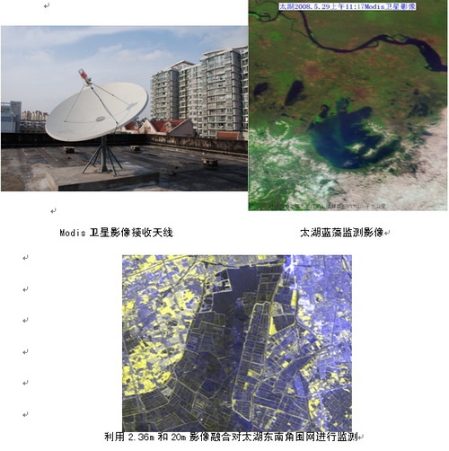 主要有Modis卫星影像接收系统、美国Field Spec3光谱仪、美国ERDAS遥感图像处理软件、美国ARCGIS地理信息系统软件、适普全数字摄影测量系统、IBM图形工作站、IBM磁盘阵列、Oracle数据库软件、IBM磁带机、日本日图42英寸大幅面扫描仪和HP大幅面绘图仪等仪器设备及软件,并建立2.36m全色和20m多光谱卫星影像库,进行太湖、里下河及海岸带等重点水域遥感监测分析。现已为省水利厅提供每日太湖蓝藻、全省卫星影像图及汛期水情监测分析服务。