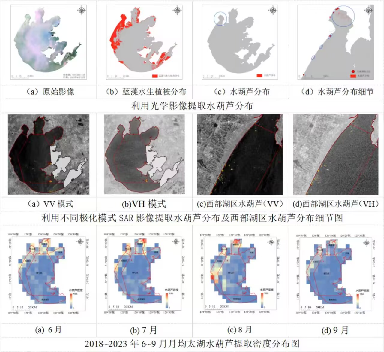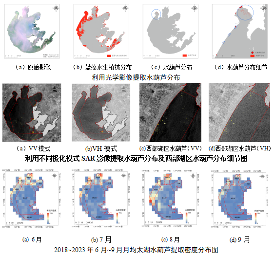 项目以太湖为研究区,综合分析了水葫芦在光学影像中的光谱特征和SAR影像中的后向散射特征,构建了不受天气气候条件限制的“光学+SAR”水葫芦提取模型,并在滆湖进行了验证。利用该模型分析了2018年至2023年太湖水葫芦聚集的时序及空间分布特征,明确了水葫芦主要分布区域,取得了较好的成效。