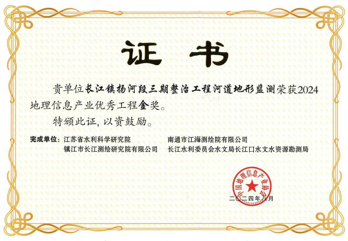 长江镇扬河段三期整治工程河道地形监测项目获奖证书