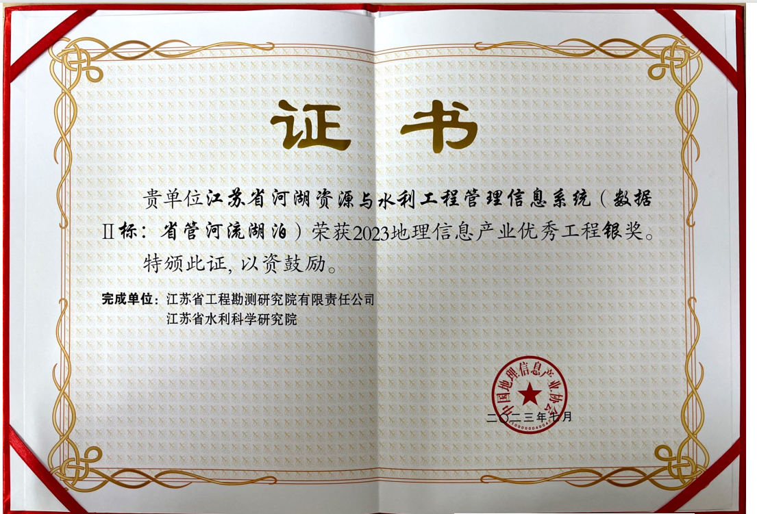 江苏省河湖资源与水利工程管理信息系统(数据II标:省管河流湖泊)项目获奖证书