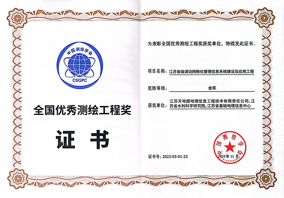 江苏省级湖泊网格化管理信息系统建设及应用工程项目获奖证书