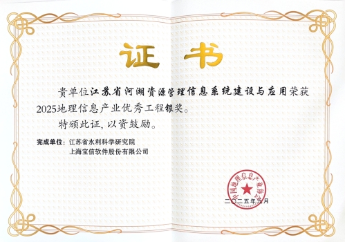 江苏省河湖资源管理信息系统建设与应用项目获奖证书