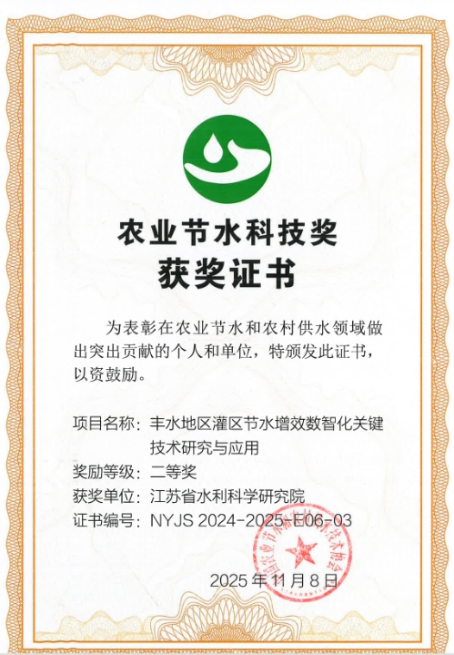 丰水地区灌区节水增效数智化关键技术研究与应用项目获奖证书