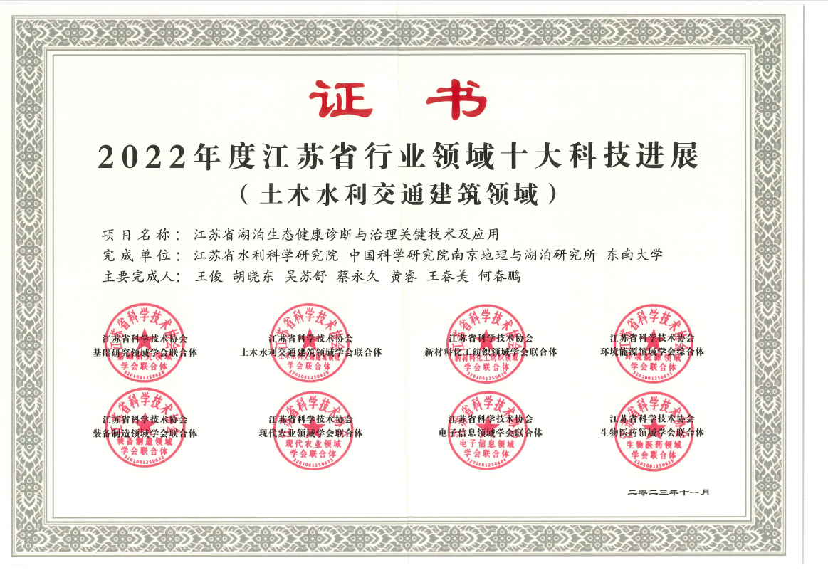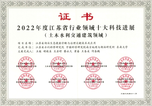 江苏省湖泊生态健康诊断与治理关键技术及应用项目获奖证书