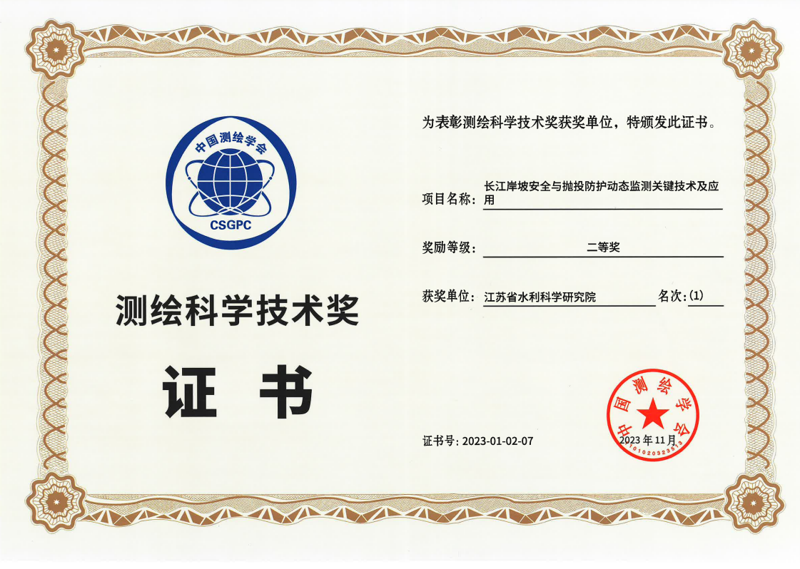 长江岸坡安全与抛投防护动态监测关键技术及应用项目获奖证书